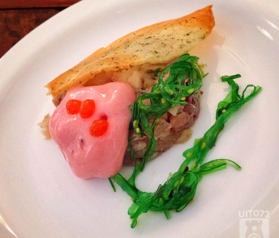 Amuse Tartaar van rauwe makreel, zeewier, vegetarische kaviaarballetjes, schuim van druiven