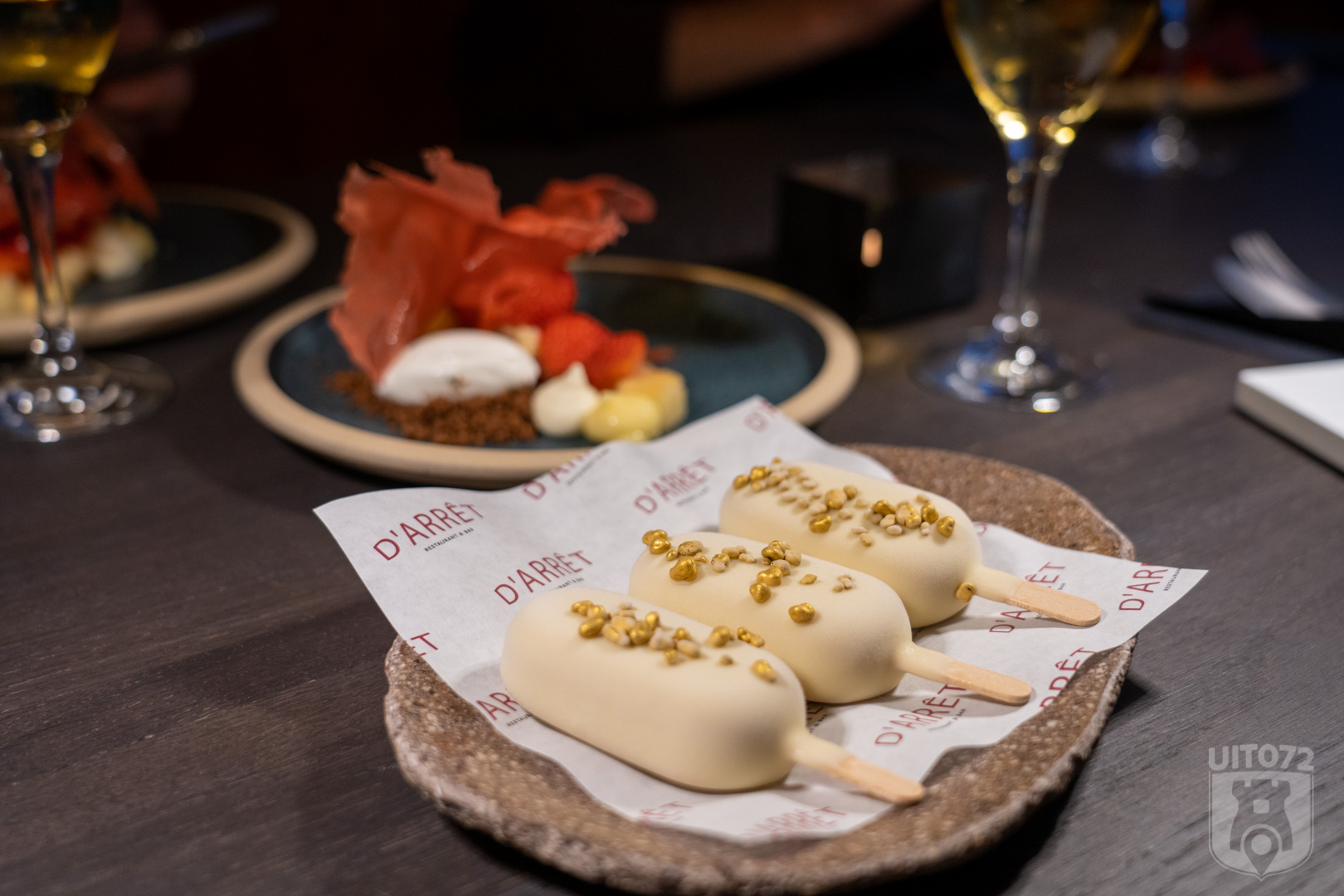 Het dessert van aardbei crème met karamelyoghurt, lemon curd en rozenijs smaakt verrukkelijk. Als kers op de taart krijgen we huisgemaakte witte mini-magnums gevuld met frambozen sorbetijs voorgeschoteld. Hemels!