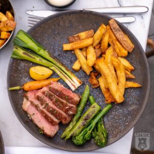 Het hoofdgerecht mogen we delen en wordt aangekondigd als “een soort grote entrecote”. We vermoeden een côte à l’os, of wat ze in de VS een club steak noemen. Goed gekruid, maar wel érg veel niet aangebakken vetrand. De steak zelf mag juist een stuk minder doorbakken.