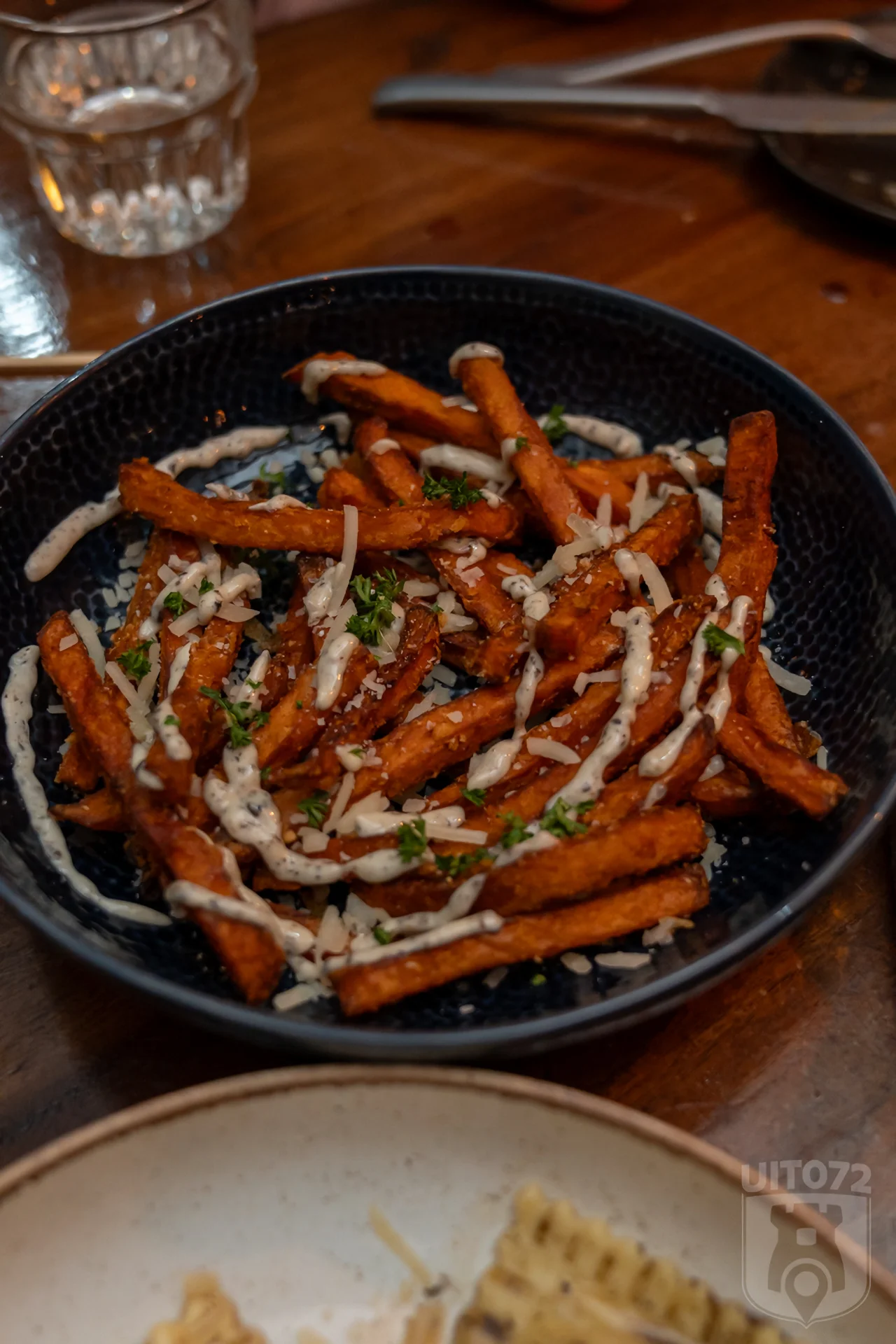 - zoete aardappelfriet met truffelmayo en Parmezaanse kaas