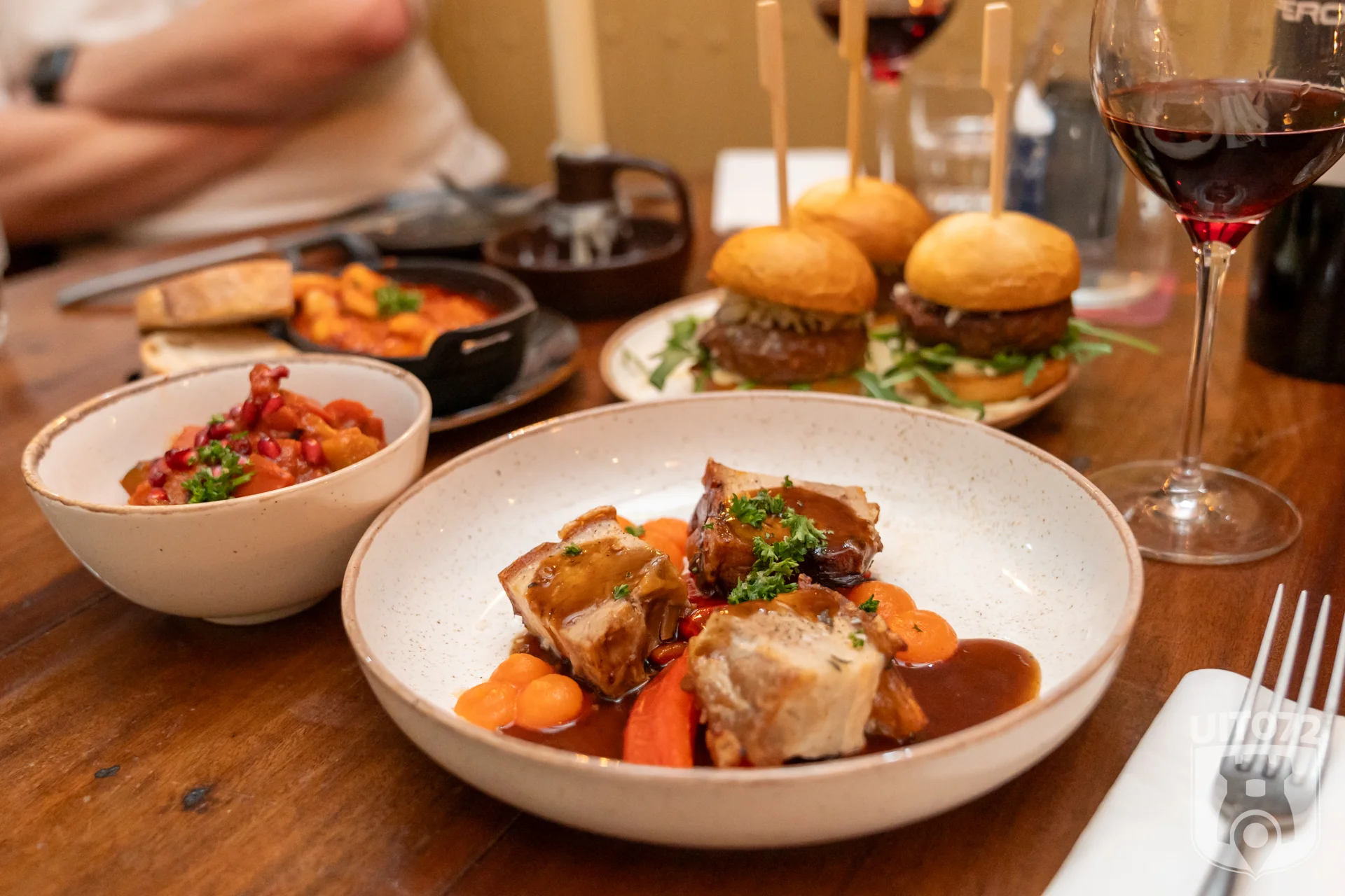 Deze mooie miniburgers zijn rijkelijk belegd met Parmezaanse kaas en goed medium-rare gebakken. De pikante gamba’s zijn flink pittig en komen met een broodje om nog lekker door de saus te halen. Het buikspek smaakt subliem met de zoetzure paprika en wortelcrème.
