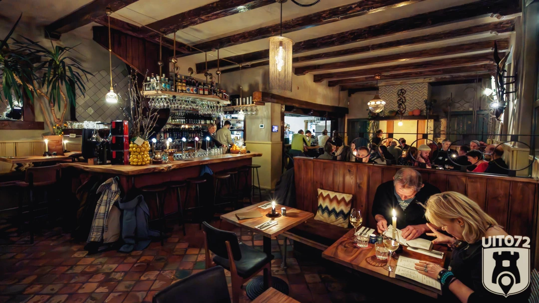Binnengekomen zien we dat de 13 balken aan het plafond zijn behouden. De sfeer is heel knus en gezellig, zonder oubollig te zijn. Het geheel heeft een vintage vibe met een moderne twist. Blikvanger is de prachtige bar die uit één stuk hout bestaat. Hier voel je je al gauw thuis!