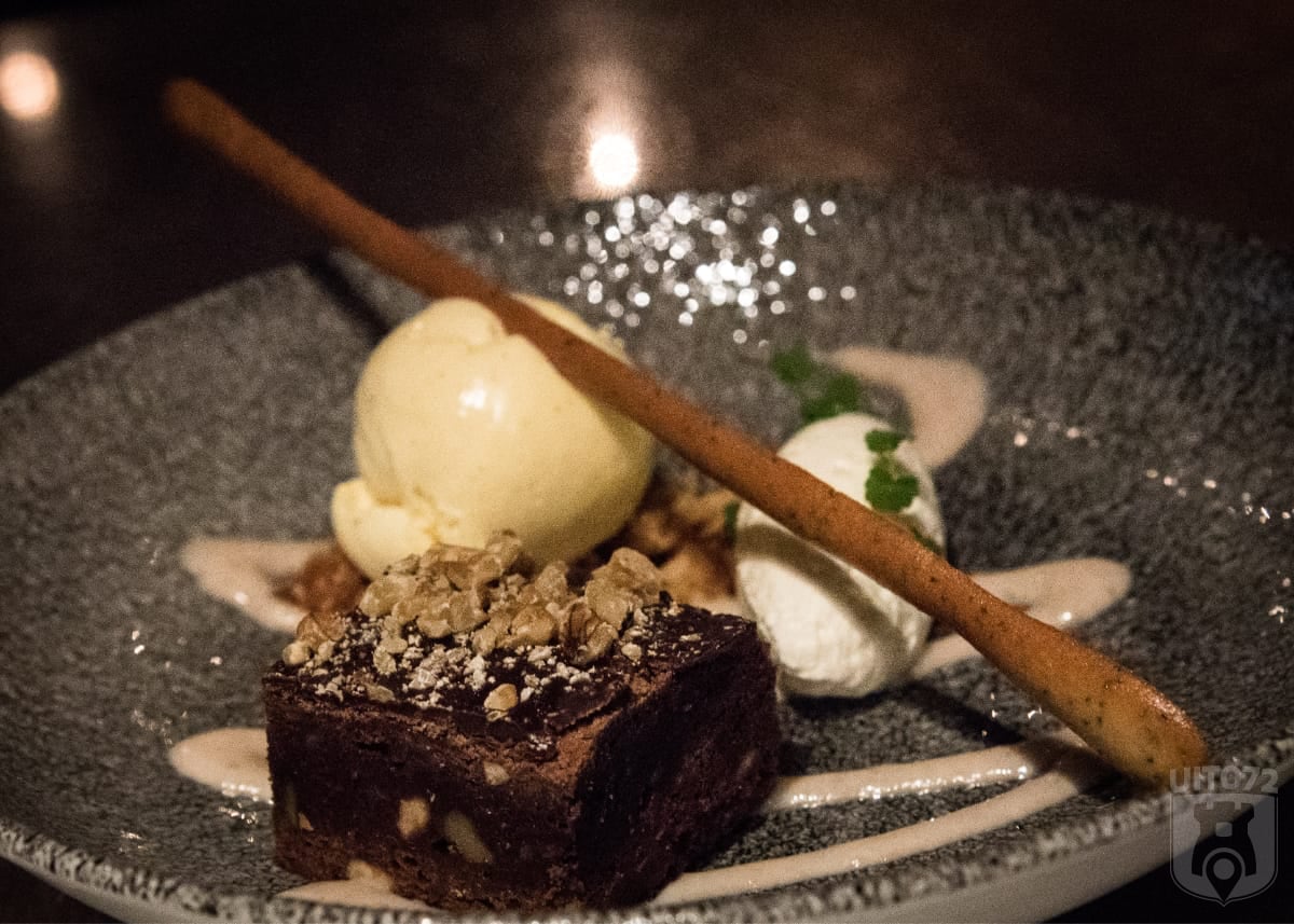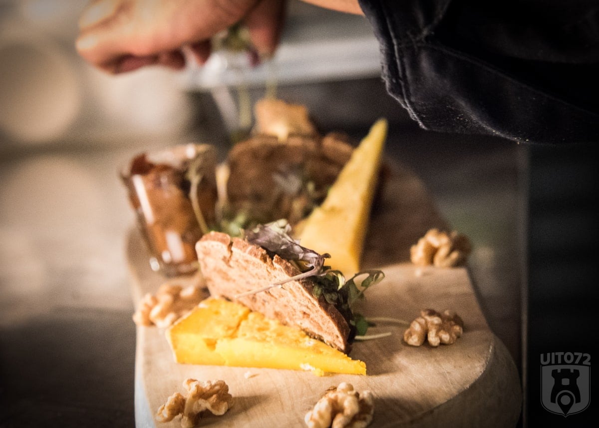 We zitten al een tijdje van ons eten en de gezelligheid te genieten, maar het feest is nog niet over. We worden getrakteerd op twee lekkere desserts. Voor de zoetekauwen is er een brownie met bananenijs – heerlijk! – en voor de liefhebbers is er een mooi kaasplankje. Die laatste bestaat uit een viertal kaasjes, oplopend in kracht.