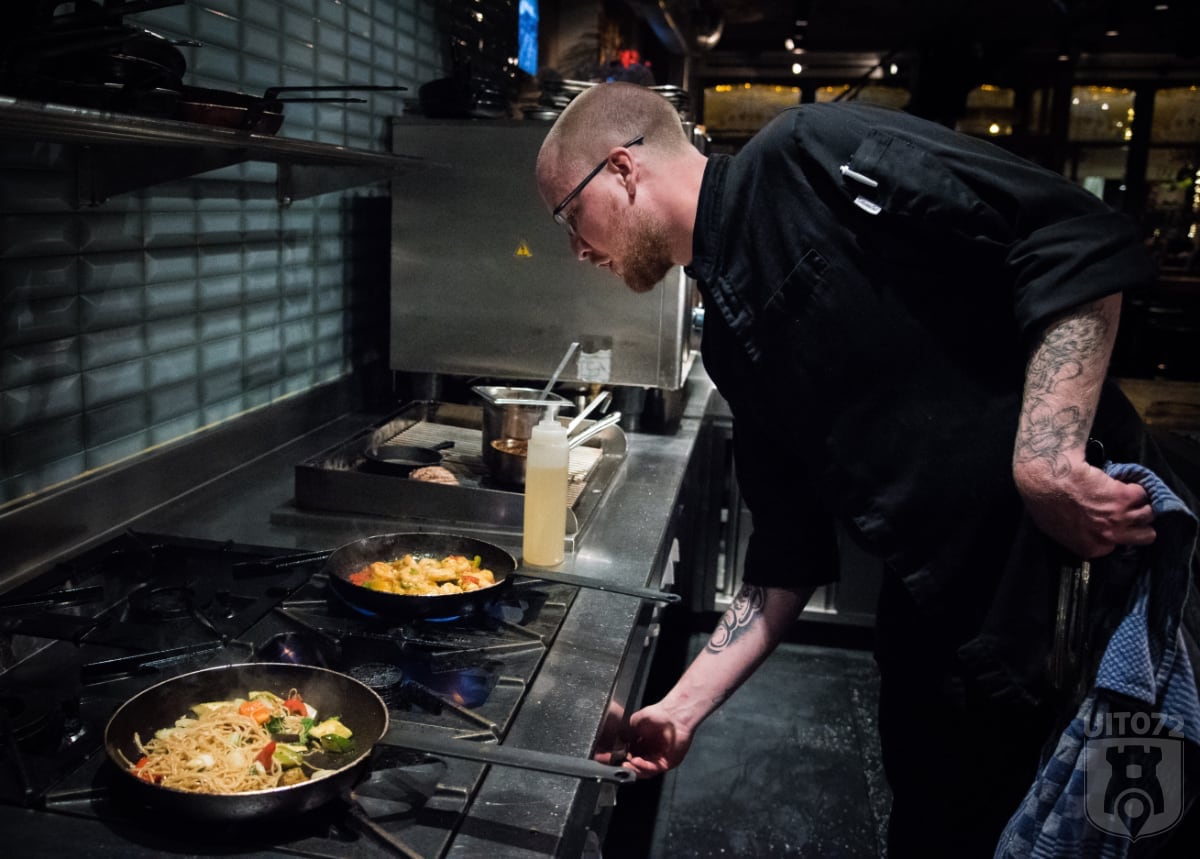 De visgerechten die we mochten proeven zijn de sizzling gamba’s en tonijn op Oosterse wijze. De laatste bestaat uit een goed stuk tonijn op een bedje van noedels met eigengemaakte Japanse saus. Helaas is de tonijn te zeer doorbakken en laten we deze een beetje links liggen – jammer. De sizzling gamba’s daarentegen zijn veel beter. De rode pepertjes maakt ze lekker pittig en met de knoflook en bosuitjes zijn ze goed op smaak.