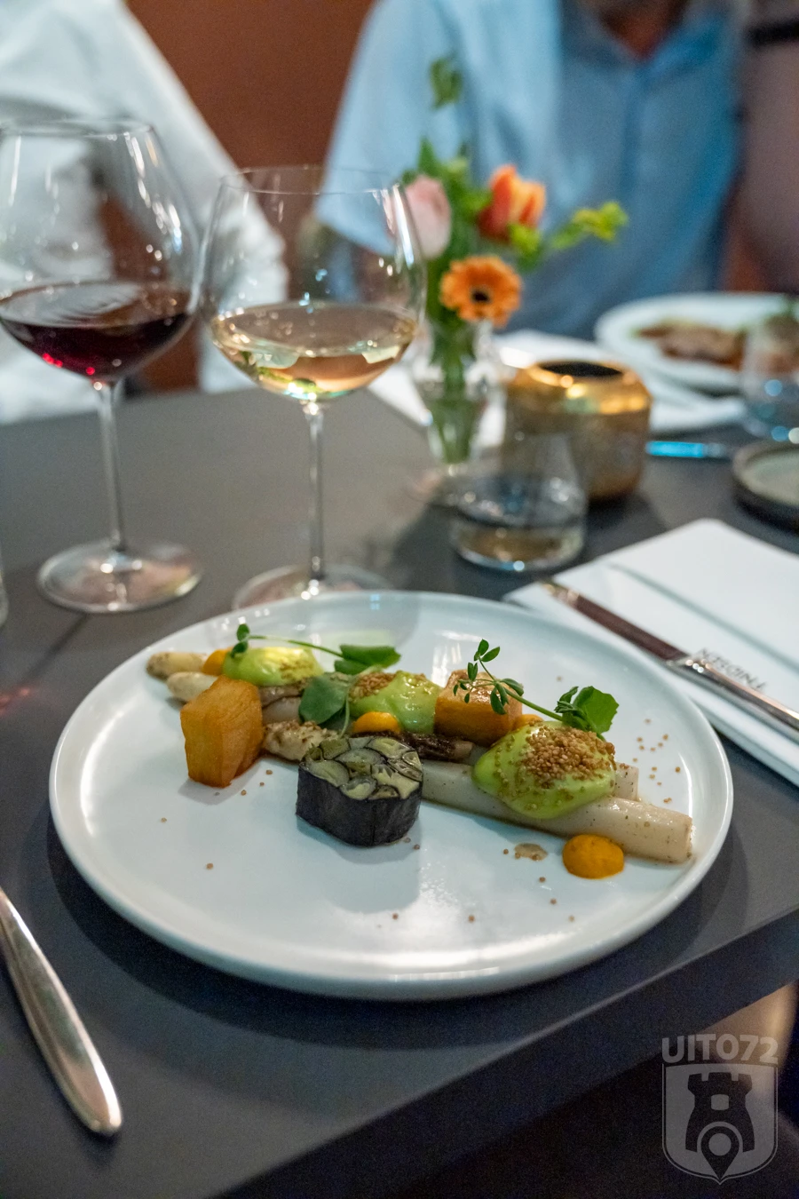 Dan volgt het eerste gerecht: voor de vlees- en viseters licht gesmoorde tonijn met tijm, rode kool en mierikswortel. Op een mooi opgemaakt bord krijgen we een kleurig smaakfestijn, waar we een Portugese witte blend bij krijgen. Het vegetarische Bloei menu schotelt ons tempura bloemkool met knoflook, rode ui en bundelzwam voor, lekker knapperig en met een fijn zuurtje. Hier drinken we een sublieme Spaanse Spaanse Savignon Blanc bij.