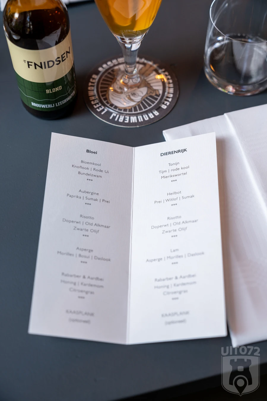 We zitten aan een tafel pal aan het Fnidsen en genieten nog van een ondergaand zonnetje. We beginnen met het eigen, blonde Fnidsen biertje. De keuze tussen het Dierenrijk en Bloei menu is zo makkelijk nog niet. Uiteindelijk besluiten twee van ons het Dierenrijk in te duiken, en één van ons gaat voor de vega-optie.