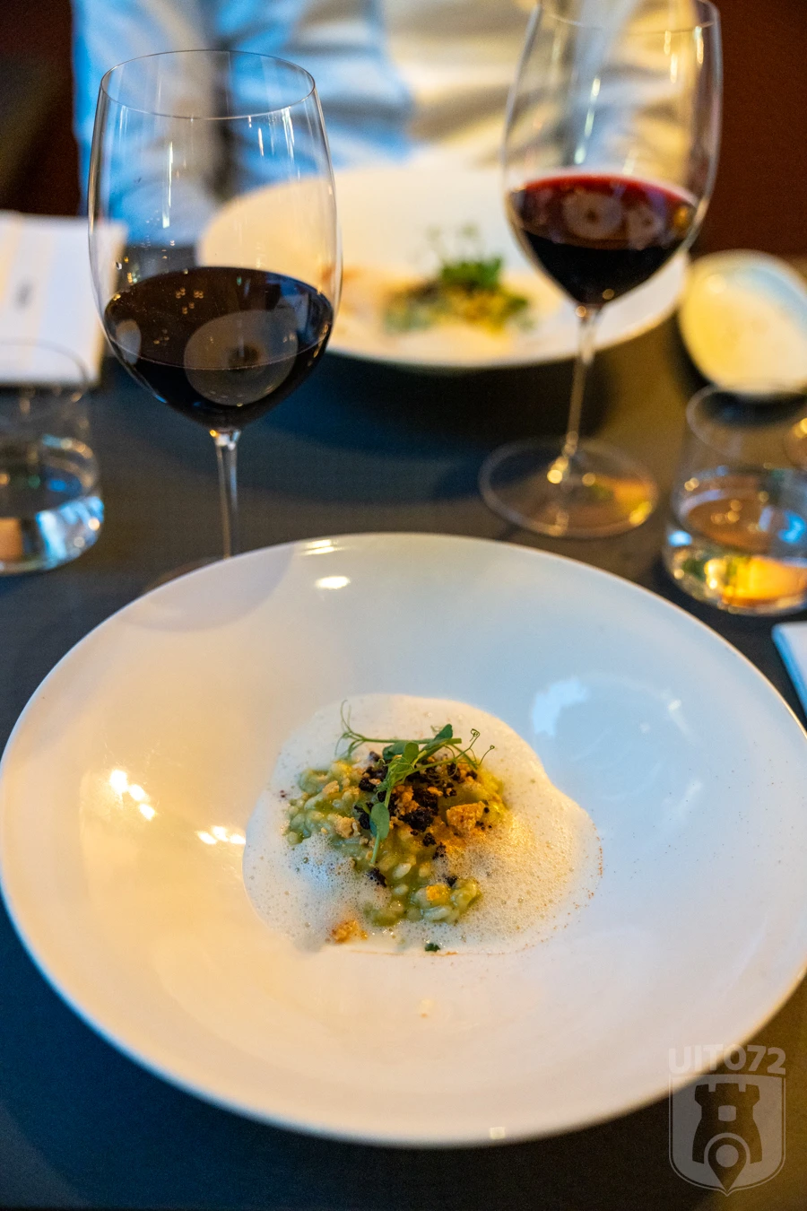Het volgende gerecht is voor beide menu’s hetzelfde. Op tafel verschijnt een risotto met Old Alkmaar kaas, zwarte olijf en doperwt in een schuim van Parmezaan. Een heerlijk smakelijk gerecht, bijgestaan door een uitstekende Montepulciano .