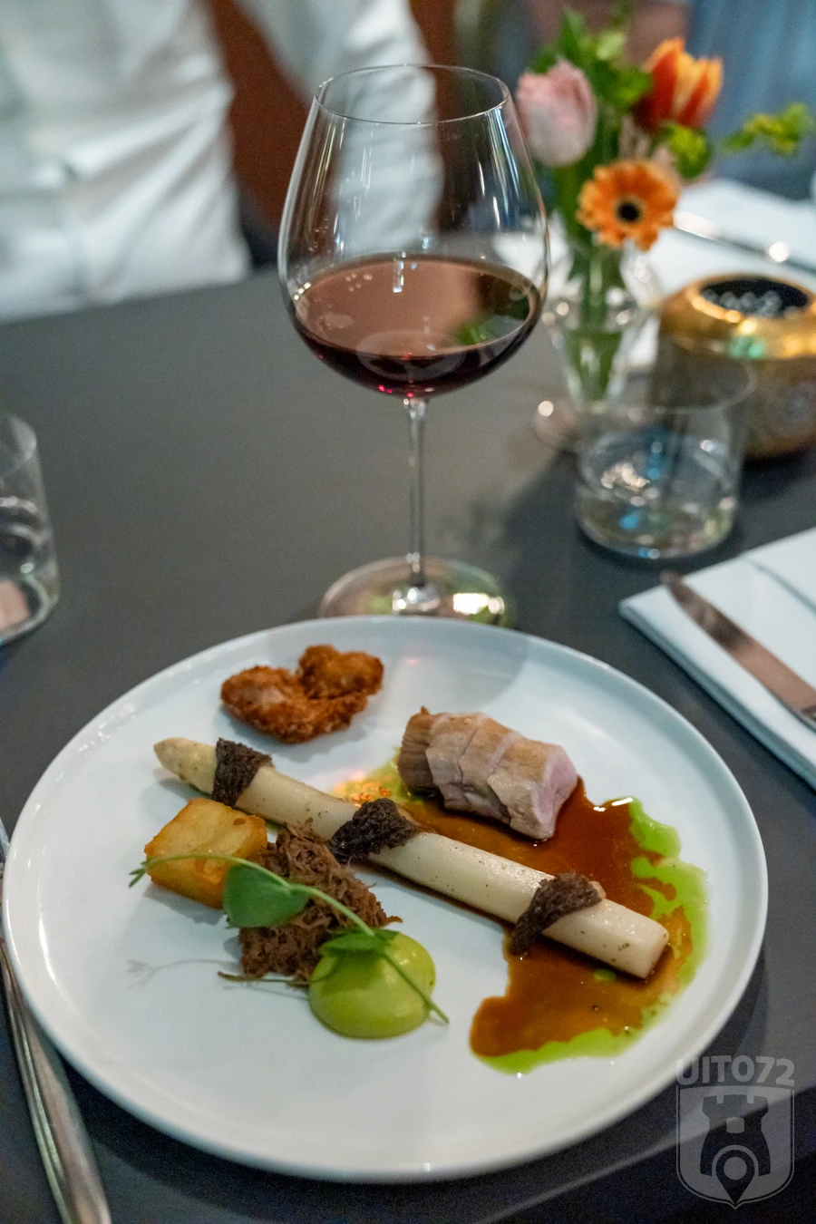 Gang vier is voor de carnivoren rilette en gepaneerde zwezerik van lam met asperge, morilles, za’atar en millefeuille van aardappel. Dit is echt smullen, wat een rijke sensatie aan smaken en texturen. Het Bloei menu schotelt ons asperge met morilles, bosui en daslook voor. Ook dit gerecht is zeer smakelijk. We drinken er een fruitige Duitse Weisburgunder (Bloei) en zachte Californische Pinot Noir (Dierenrijk) bij.