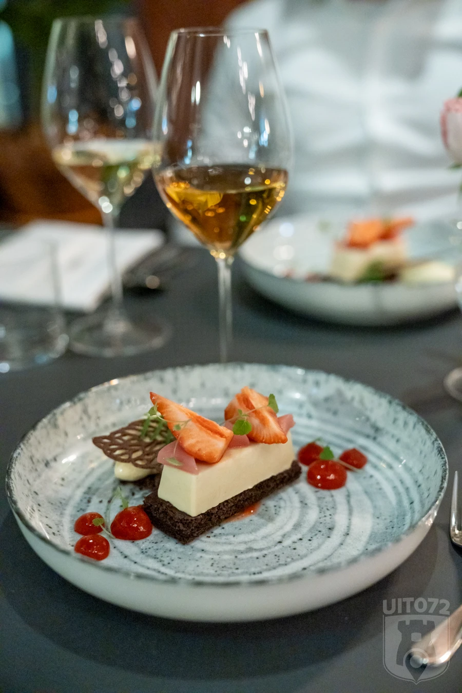 Wat betreft het dessert gaan we ook deze keer voor zowel zoet als hartig. Het zoet bestaat uit een panna cotta van aardbei en rabarber met honing en kardemom, dragon en citroengrasijs. Ook hier knalt een breed palet aan smaken je mond binnen. Het hartig komt in de vorm van een kaasplankje met vier heerlijke kaasjes vergezeld van zoete brioche en bloedsinaasappelcompote. Het zoete dessert wordt geaccompagneerd door een Moscatel en de kaas door een Pineau des Charentes Blanc, die beide smooth, dik en honingzoet zijn.