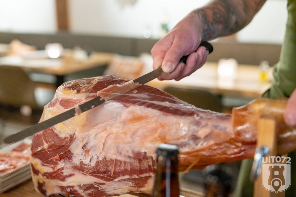 Wij starten met een wijntje. In een ooghoek zien we dat Sam aan komt rijden met een tafeltje met daarop een mooi stuk serranoham aan het been. Aan onze tafel wordt de ham vervolgens vers gesneden in mooie plakken. Fijne appetizer!