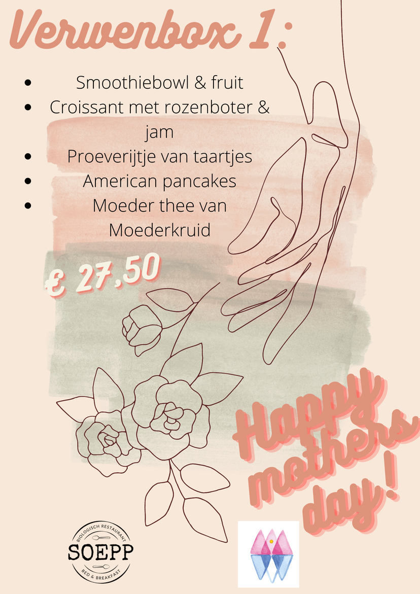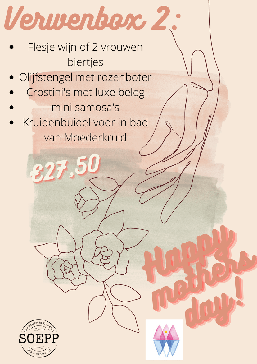 Soepp komt met twee Moederdag verwenboxen. De een is om lekker mee te ontbijten of te brunchen, en met de ander realiseer je in een handomdraai een complete borrel met hapjes en drankjes. Na de borrel kan moeders meteen lekker ontspannen in bad, met de inbegrepen kruidenbuidel van moederkruid.