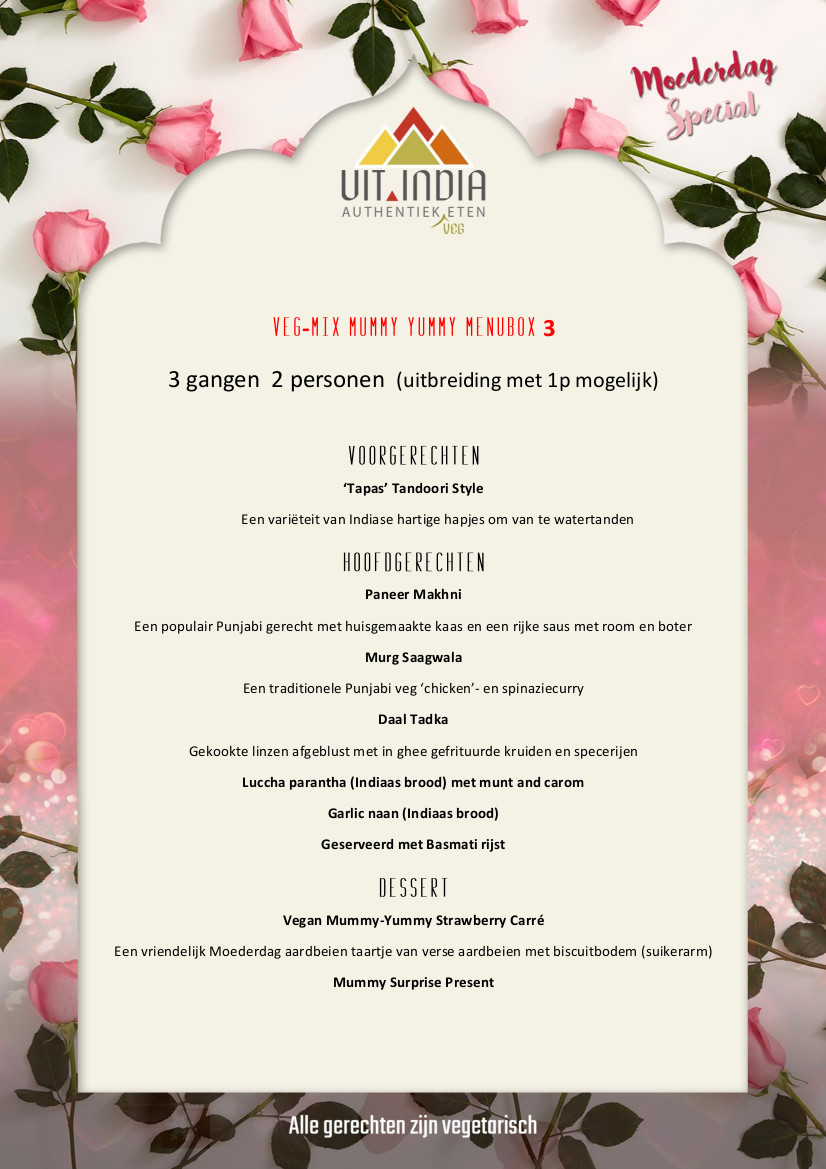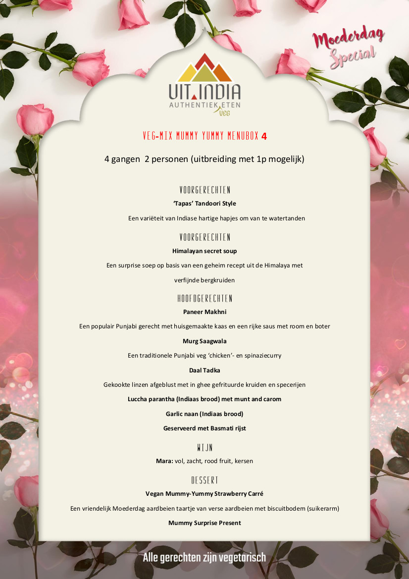 Vegetarisch, Indiaas en vooral heel lekker. Met de Veg-Mix Mummy Yummy Menubox van UIT INDIA wordt deze Moederdag warm en speciaal! Je hebt de keuze uit een 3- of 4-gangenmenu. In beide boxen vind je ook een Mummy Surprise Present.