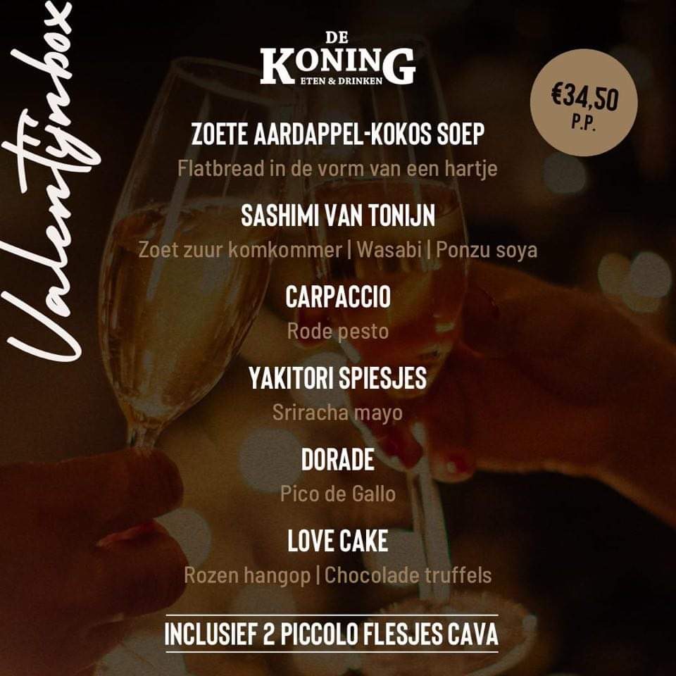Dit is natuurlijk niet de originele tekst, maar de love boat vaart helaas niet meer uit om jullie kant op te komen. De lovebox van de Koning daarentegen, die kan jullie wel gewoon bereiken. Die is namelijk het hele Valentijnsweekend te bestellen. Dim het licht, zet de muziek op waar jullie voor het eerst samen op hebben geschuifeld en smikkel van de zes fantastische gerechtjes die dit menu jullie te bieden heeft. De box is inclusief een klein flesje cava per persoon.