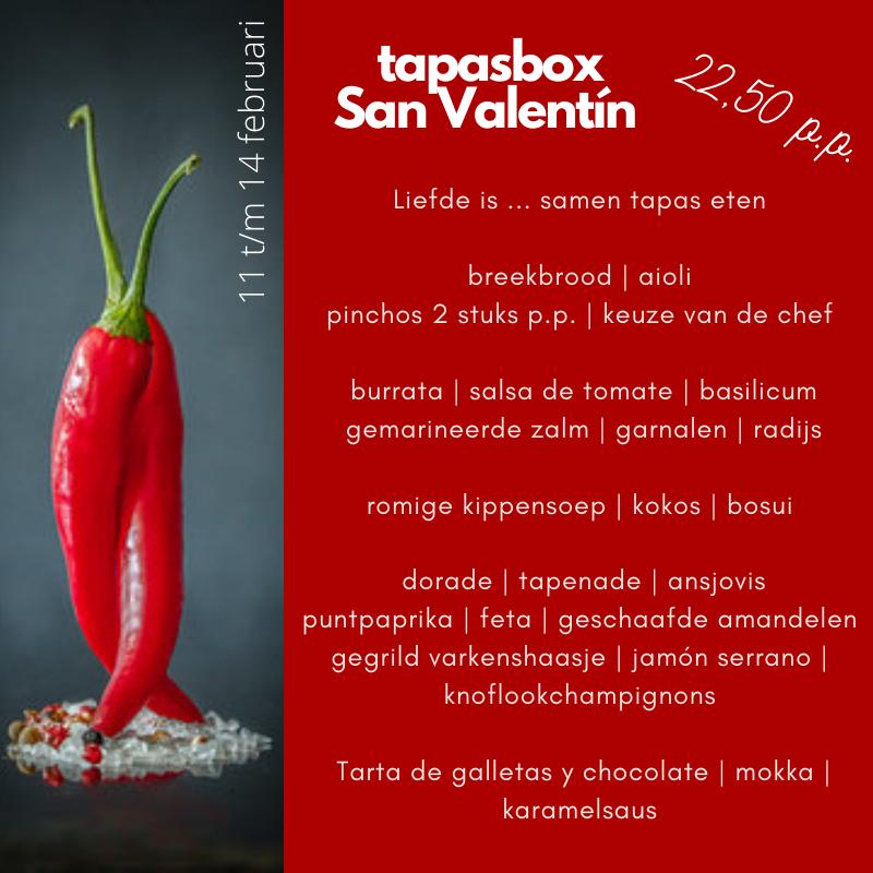Tijdens het Valentijnsweekend staat de tapasbox ook in het teken van de liefde. Een goedgevuld tasje vol met verschillende koude en warme tapas. Je kunt alle gerechtjes in één keer op tafel zetten, of je kunt ze in gangen serveren. Een compleet menu: van het broodje vooraf tot aan een dessert. Het zit er allemaal in. Voor een uitgebreide Spaanse día de San Valentín beleving is er ook een te gekke superdeal voor 2 personen: een Valentijnsontbijt, een tapasbox en een fles cava, voor € 85,-.