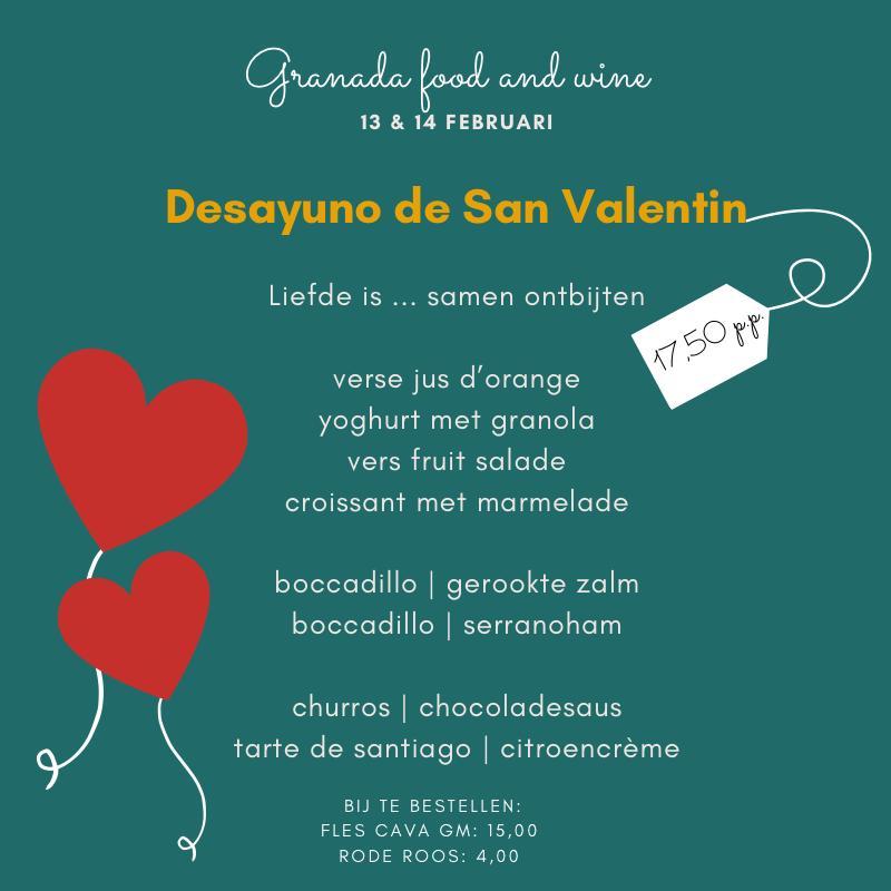 Uitgebreid ontbijten staat inherent aan rust en ontspanning. Veel mensen doen dit alleen op vakantie omdat ze er vaak geen tijd voor hebben, of omdat ze het te veel werk vinden. Tijd moet je zelf maken. Voor dat laatste probleem is er een oplossing: een heel weekend lang kun je gebruik maken van de ontbijtservice van Granada Food and Wine. Valentijnsdag duurt bij hen namelijk niet één maar twee dagen. Wil je dus op 13 en 14 februari (één dag mag ook) met jouw geliefde lekker in bed blijven liggen, en genieten van een ontbijt met een Spaans tintje? Bestel dan het Desayuno de San Valentin. Je kunt het ontbijt extra aankleden met een fles cava en een rode roos.
