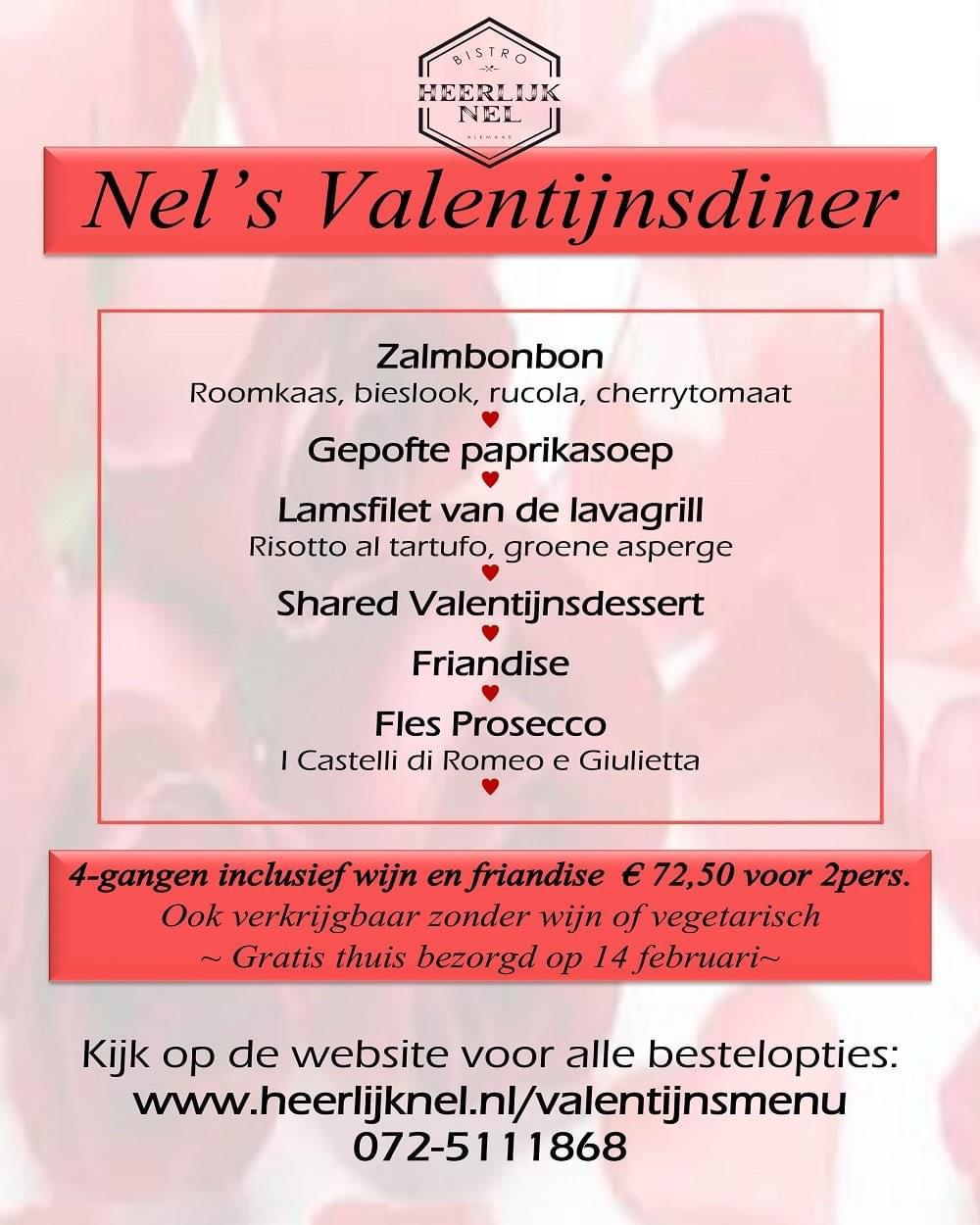 Kijk je meer uit naar Valentijnsavond, bestel bij Nel dan het 4-gangenmenu. Je krijgt: 4 gangen met een fles prosecco en friandises. Je kunt het menu ook bestellen zonder prosecco. Liever een vegetarisch menu? Zelfs dat is geen probleem bij deze bistro.