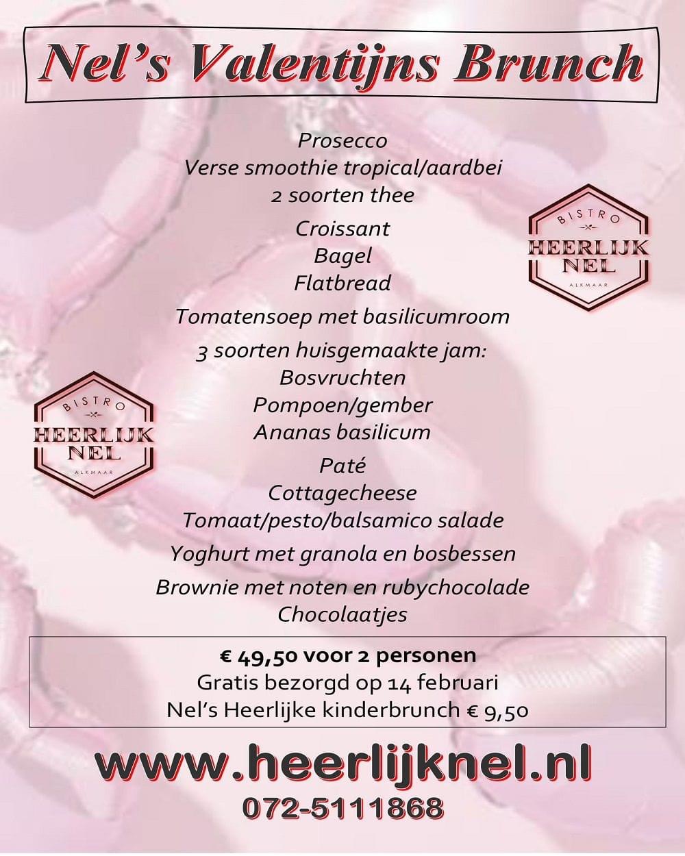 Opties: Nel’s Valentijns Brunch of Nel’s Valentijnsdiner. Eventueel aan te vullen met een kinderbrunch, een fles prosecco, een doos luxe bonbons en Nel’s (H)eerlijke vragenspel
