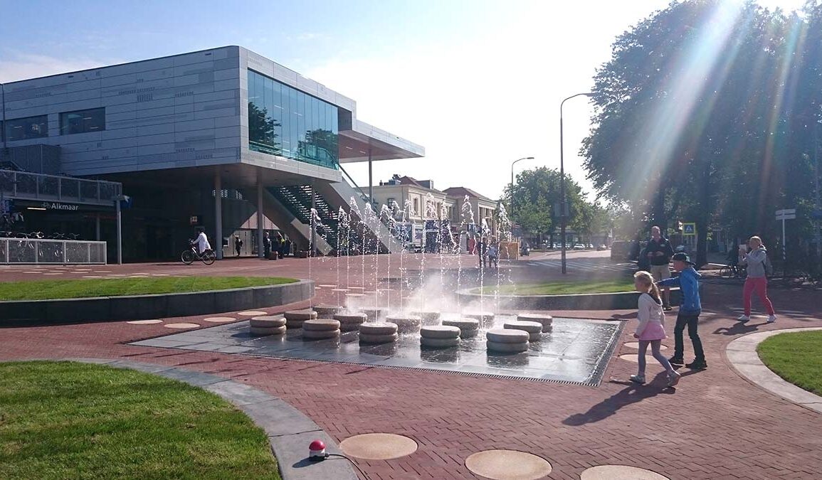 Vandaag is de kaasfontein op het voorplein van het station Alkmaar feestelijk geopend. Wethouders Jan Nagengast (CDA) en Victor Kloos (OPA) drukten samen met Eelco Kooistra van Rots Maatwerk op de knop om het waterelement aan te zetten.